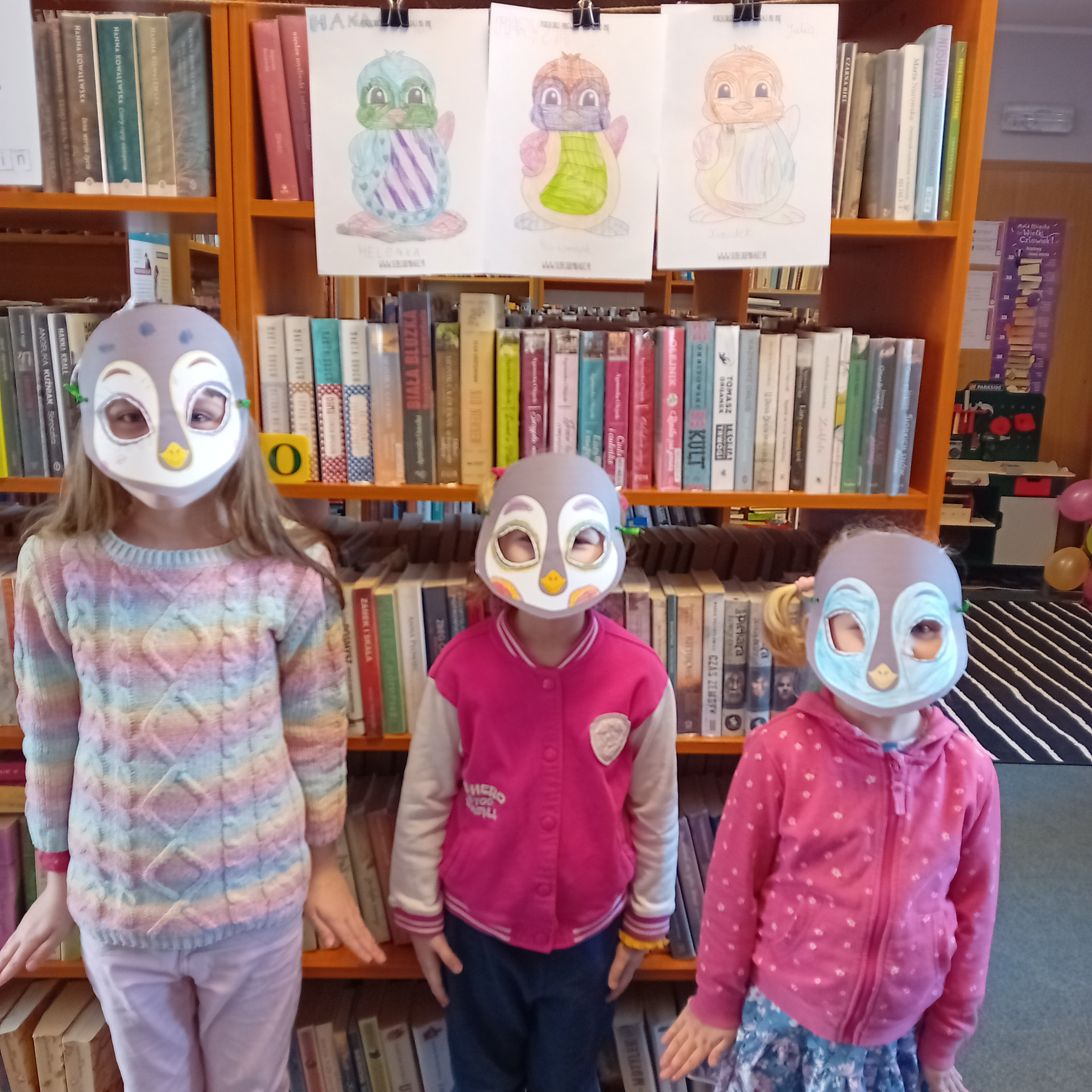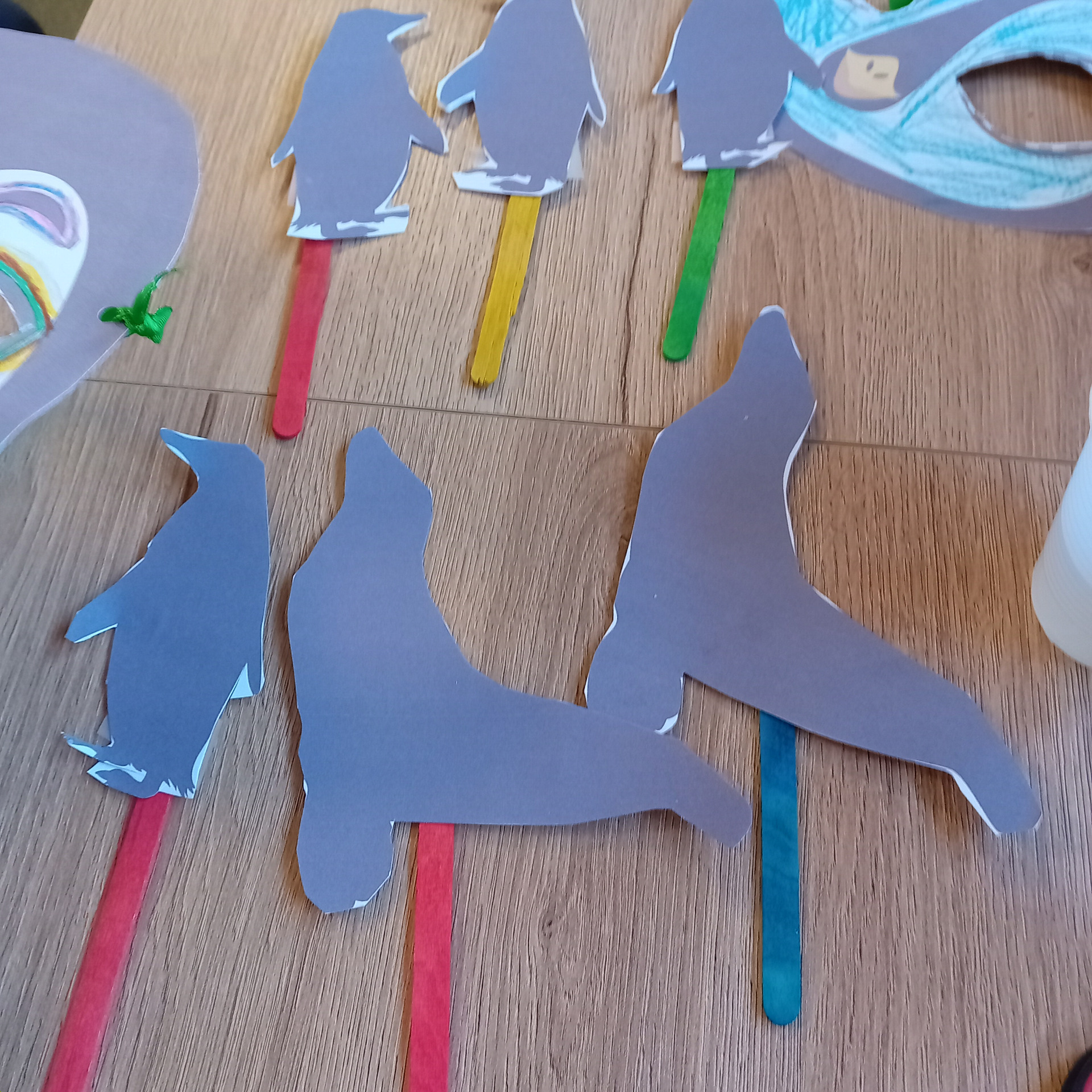 W drugiej części spotkania odbyły się warsztaty plastyczne, dzieci wykonały pingwinki z kartonu, namalowały portret swojego ulubieńca, potem wykonały maskę i postacie do teatru cieni. Były też zadania matematyczne i quizy.