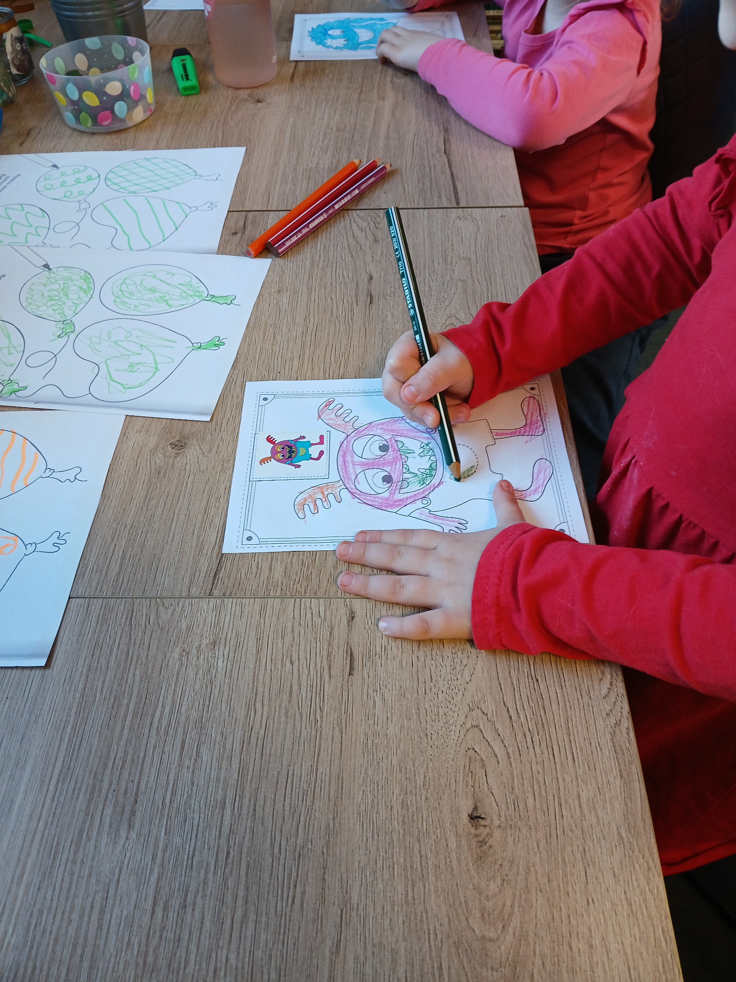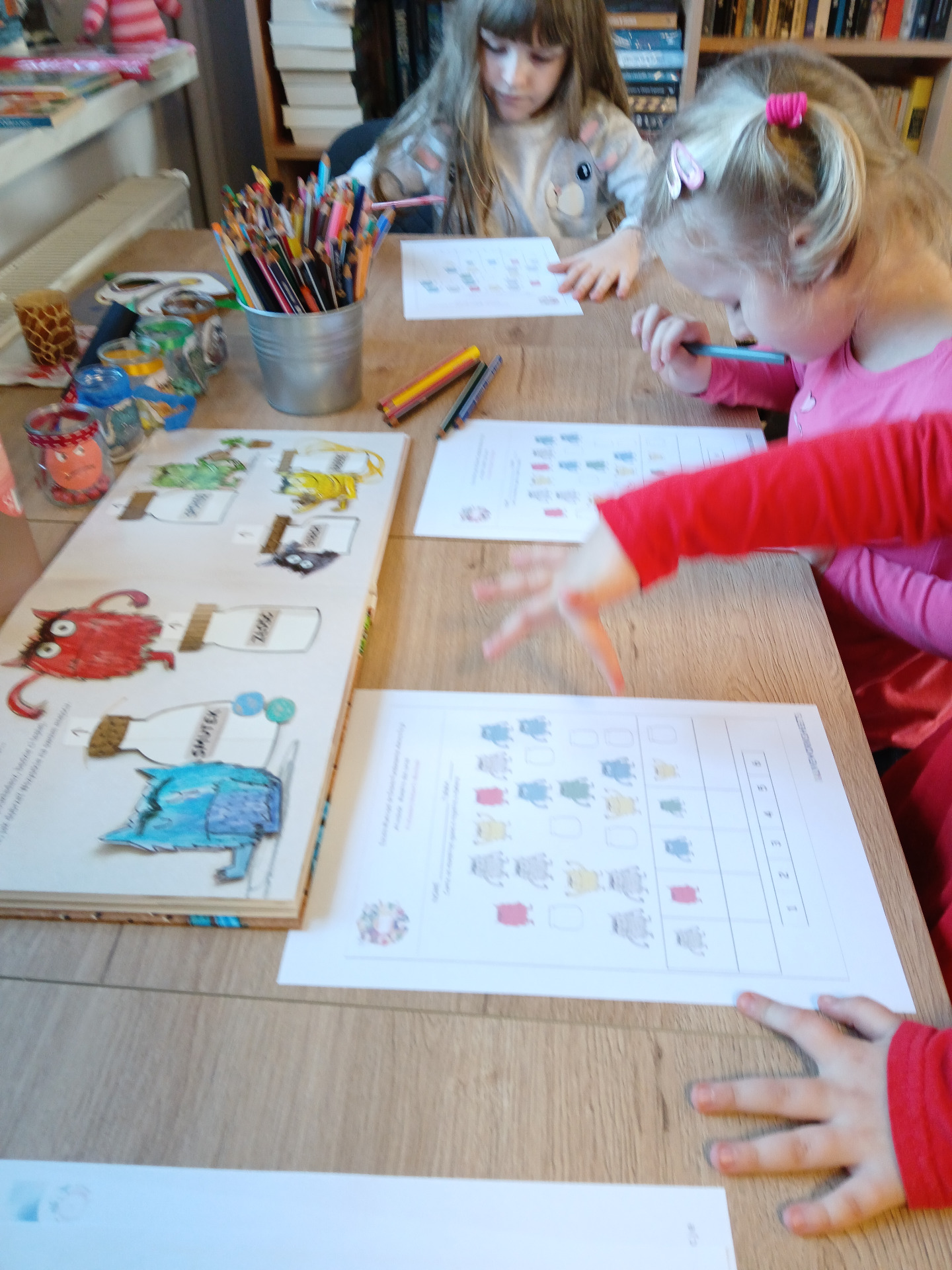 W czasie kolejnego spotkania feryjnego dzieci poznały wachlarz emocji, od radości do smutku. Bibliotekarka przeczytała dzieciom opowiadania o Albercie i Franklinie, którzy bardzo się bali. Potem uczestnicy poznali kolorowego potwora, który zmieniał kolory zależnie od przeżywanych emocji. Zadaniem dzieci było posegregowanie koralików i przyporządkowanie ich do odpowiedniej grupy. Dzieci wykonały też szereg zadań dotyczących kolorowego potwora. Odbyły sie też zabawy z kołem i piłeczkami, zagrały w znaną grę "Raz, dwa, trzy Baba Jaga patrzy". Gotowały zupę czarownicy. Śmiechu było dużo i zarazem świetna zabawa.