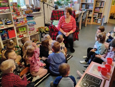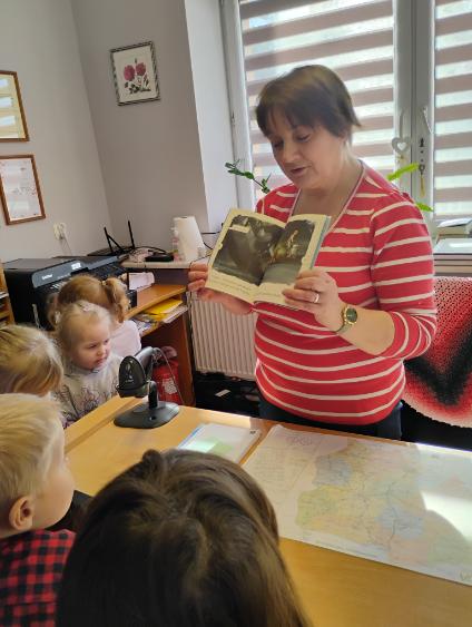 Wspólnie odbyliśmy krótki spacer po bibliotece, podczas którego maluchy dowiedziały się, jak są uporządkowane książki oraz jak można z nich korzystać. Z ogromnym zaciekawieniem oglądały półki pełne kolorowych okładek, a niektóre z nich już teraz nie mogą się doczekać, kiedy będą mogły wypożyczyć swoje pierwsze książeczki!